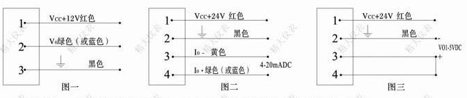 ELZ-Ⅱ型標(biāo)準(zhǔn)電流模擬量4-20mA輸出:工作電壓VCC+24V,最大工作電流0.2A,負(fù)載電阻最大500Ω(恒流),接線見圖二;或標(biāo)準(zhǔn)電壓模擬信號(hào)Vo1~5V輸出,接線見圖三)