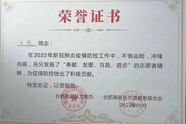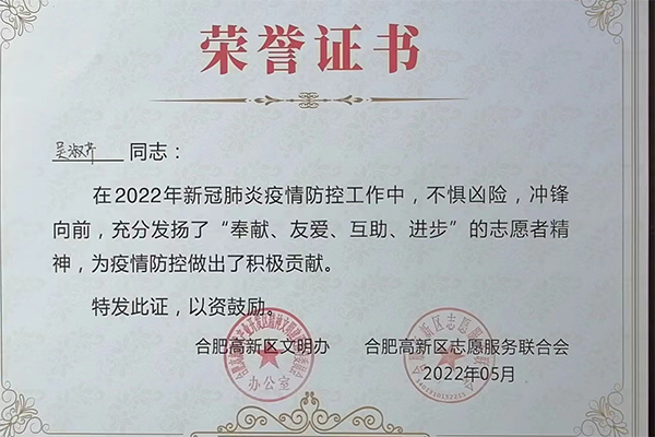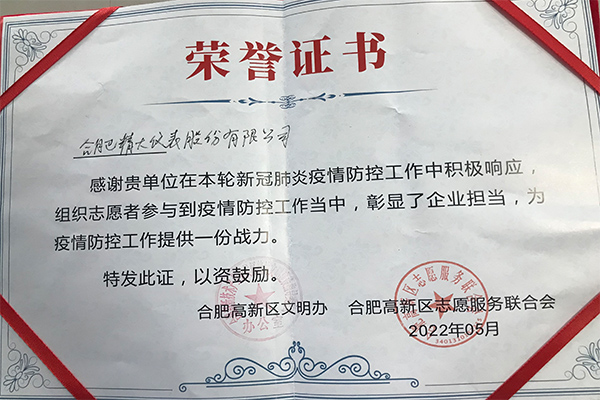 合肥精大儀表股份有限公司在新冠肺炎疫情防控工作中積極響應(yīng),組織志愿者參與到疫情防控工作中,彰顯了企業(yè)擔(dān)當(dāng),為疫情防控工作提供一份戰(zhàn)力。黨員王欣、吳淑芹二位同志在2022年新冠肺炎疫情防控工作中,不懼兇險(xiǎn),沖鋒向前,充分發(fā)揚(yáng)了“奉獻(xiàn)、友愛、互助、進(jìn)步”的志愿者精神,為疫情防控做了了積極的貢獻(xiàn)。公司和個(gè)人被高新區(qū)文明辦、和高新區(qū)志愿服務(wù)聯(lián)合會(huì)授予此榮譽(yù)證書。